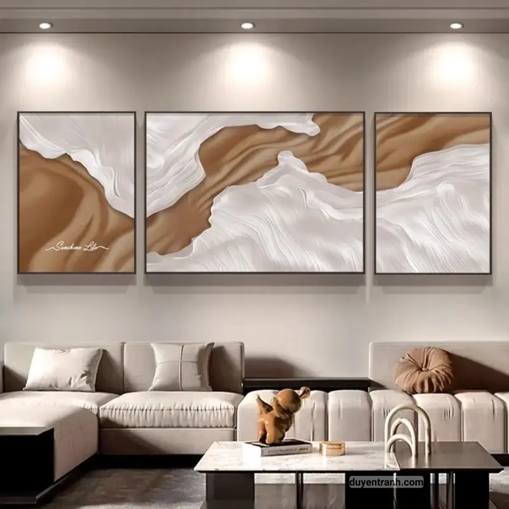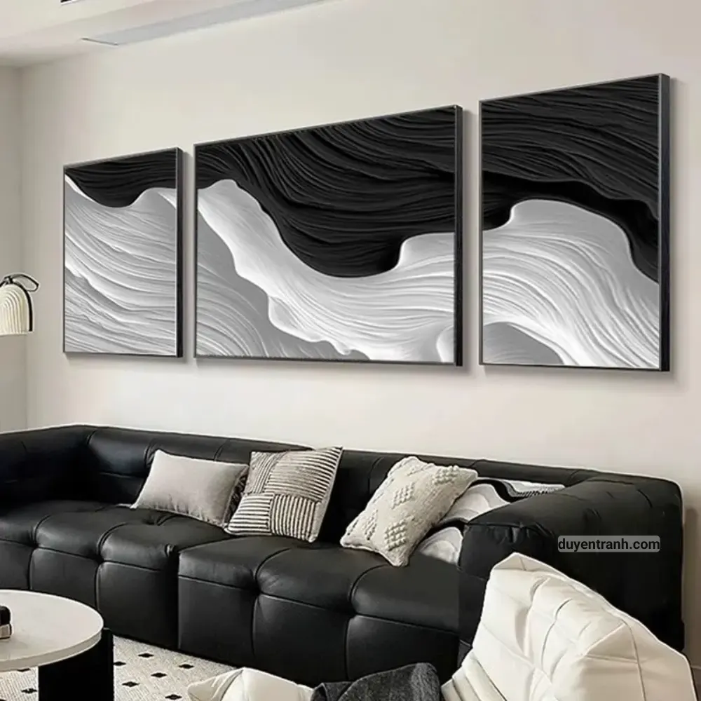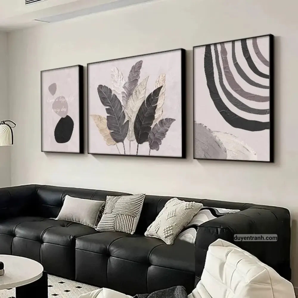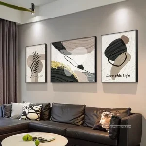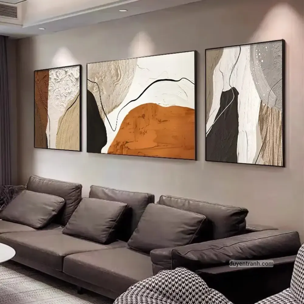 Bộ 3 tranh canvas trừu tượng là cách nhanh nhất để tạo điểm nhấn cho bức tường trống. 3 bức tranh cùng chủ đề, cùng tông màu, treo cạnh nhau tạo thành một tổng thể hài hòa – phù hợp treo trên sofa phòng khách, tường đầu giường phòng ngủ, hoặc hành lang.