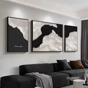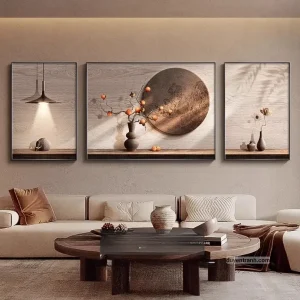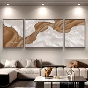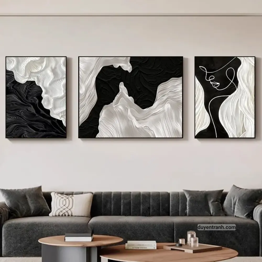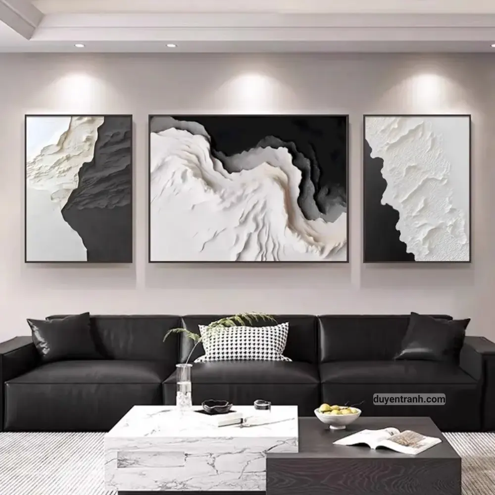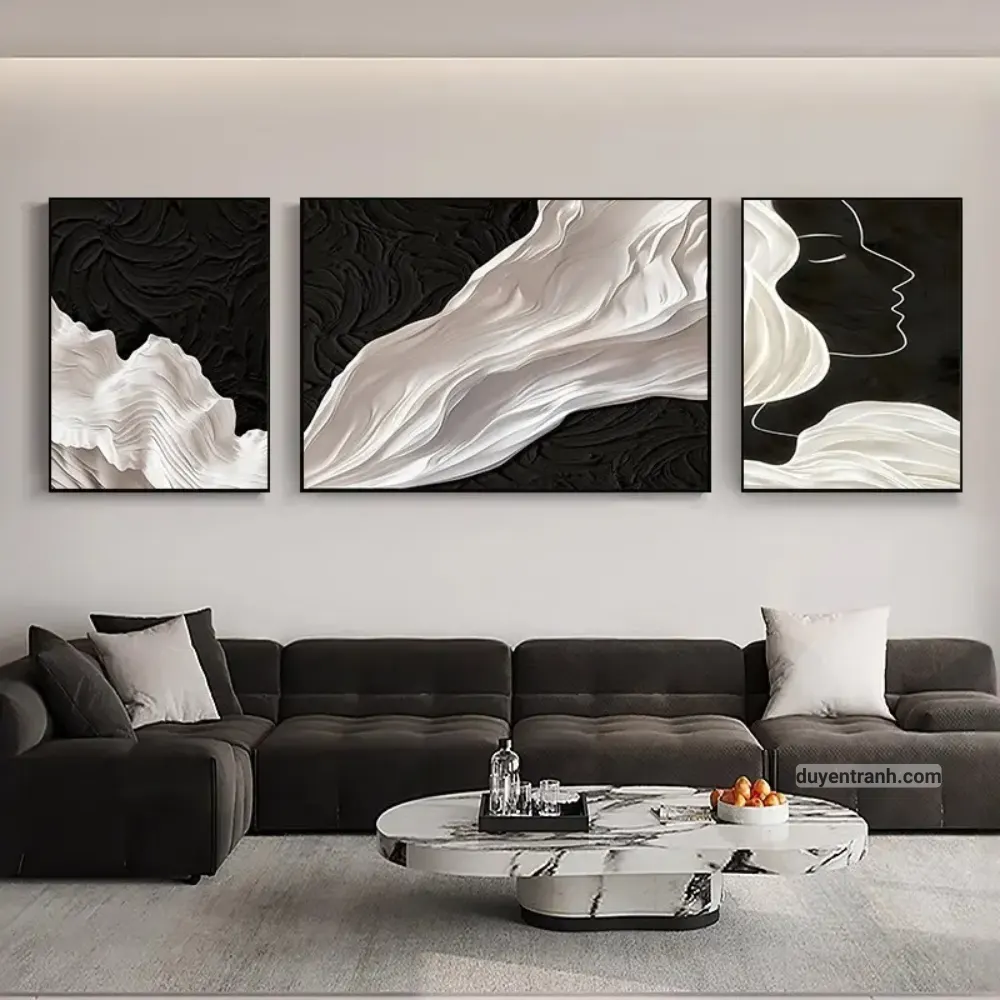 Bộ 3 tranh canvas trừu tượng là cách nhanh nhất để tạo điểm nhấn cho bức tường trống. 3 bức tranh cùng chủ đề, cùng tông màu, treo cạnh nhau tạo thành một tổng thể hài hòa – phù hợp treo trên sofa phòng khách, tường đầu giường phòng ngủ, hoặc hành lang.