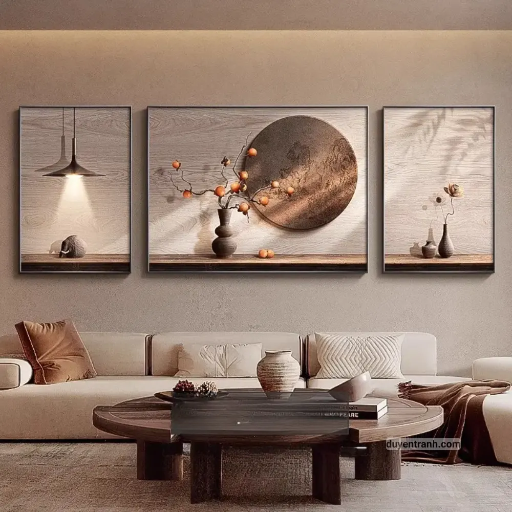 Phòng khách – trên sofa: Vị trí phổ biến nhất. Chọn bộ 40×60 cho tường rộng, 30×40 cho tường vừa. Treo 3 bức ngang hàng, cách nhau 5-8cm, tâm tranh ngang tầm mắt (~155cm từ sàn).