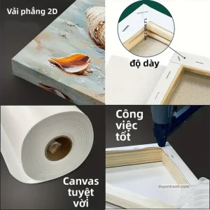 Tranh được in UV trên vải canvas (vải bố) rồi căng trên khung gỗ thông – cho bề mặt có texture (vân vải) giống tranh sơn dầu thật, khác hẳn tranh in trên giấy hay formex phẳng lì. Mỗi bộ kèm đinh treo – mua về treo được ngay, không cần mua thêm phụ kiện.