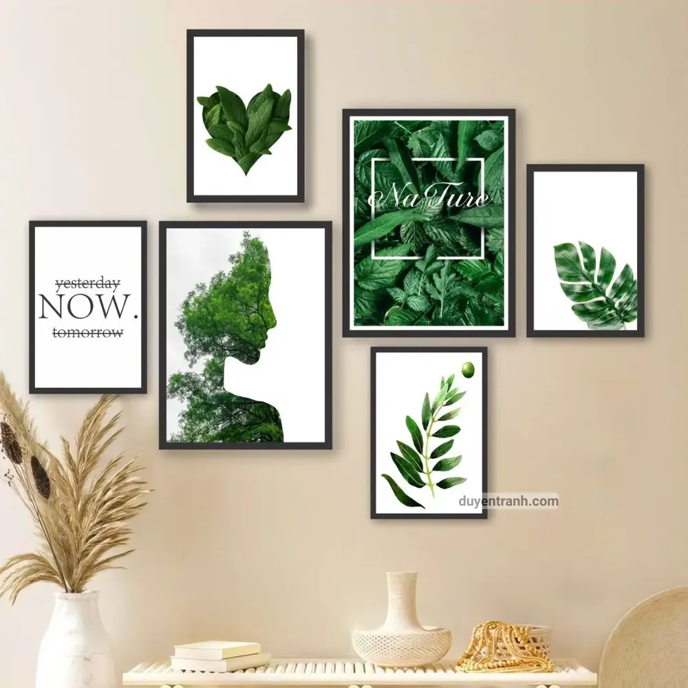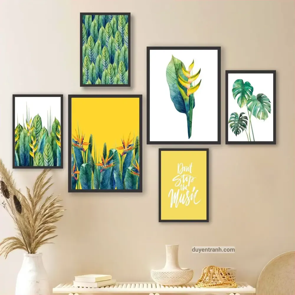 Bộ 6 tranh chủ đề hoa lá, cây xanh nhiệt đới – in trên formex 5mm chống nước, phủ PP cao cấp. Viền đen in trực tiếp trên tranh tạo hiệu ứng có khung, không cần mua thêm khung ngoài. Phía sau có sẵn keo dán 2 mặt – bóc ra dán lên tường ngay, không cần khoan, không cần đinh. Phù hợp phòng khách, phòng ngủ, phòng ăn, hành lang, quán cafe, spa.