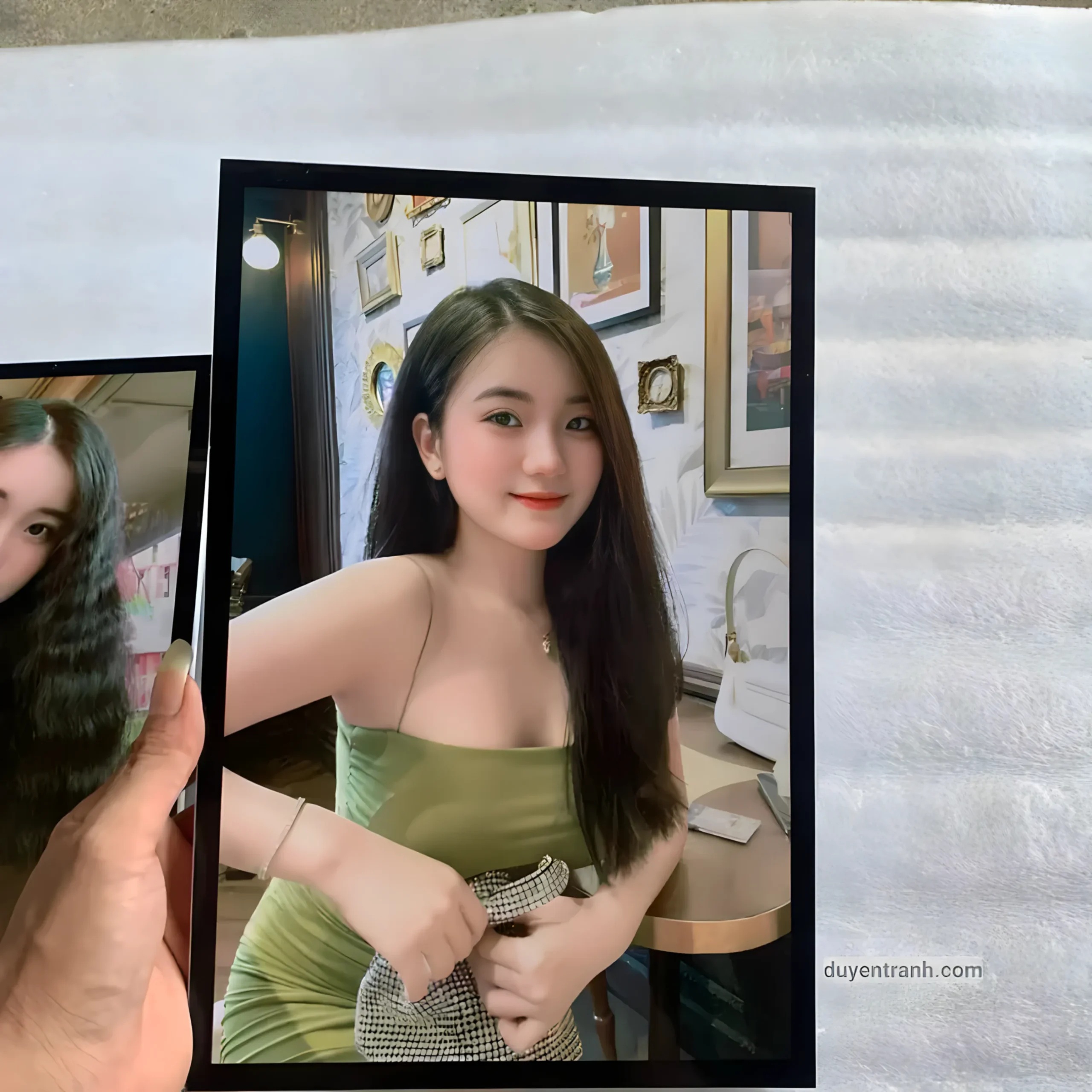 Khi nhận hàng, nhớ bóc lớp nilon bảo vệ trên mặt mica để ảnh đạt độ bóng tối đa. Formex nhẹ nhưng dễ gãy nếu bị uốn hoặc va đập mạnh — tránh đè nặng lên ảnh. Duyên Tranh đóng gói bằng xốp chống sốc + thùng carton cứng để đảm bảo an toàn khi vận chuyển.
