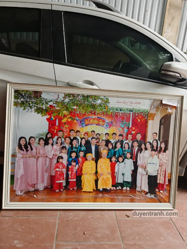 Bức ảnh mừng thọ khổ lớn kèm khung gỗ mà xưởng Duyên Tranh vừa hoàn thiện cho một gia đình tại Hà Nội – Xuân Bính Ngọ 2026. Ảnh chụp đại gia đình hơn 30 thành viên trong lễ mừng thọ ông bà, in ép lụa trên chất liệu cao cấp, khung composite viền bạc.