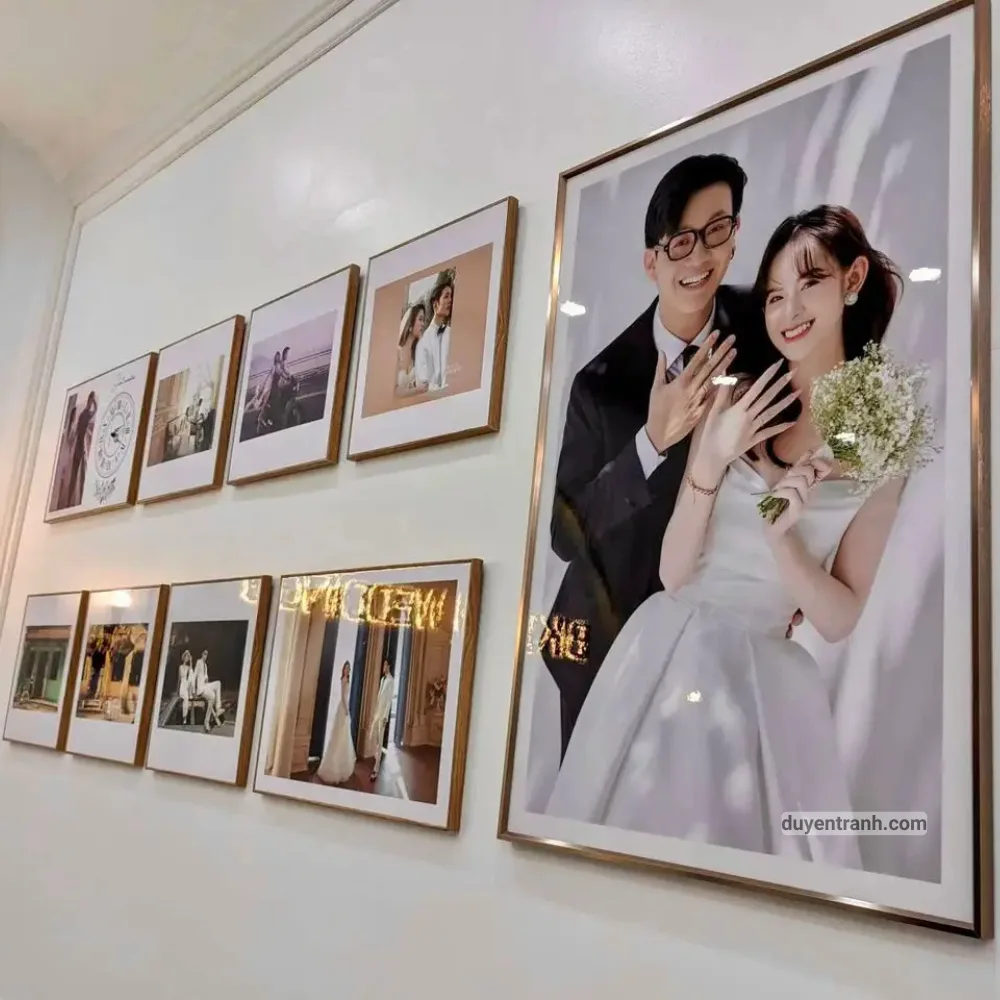 Phòng ngủ: ảnh cưới, ảnh gia đình — nên chọn khung composite trắng hoặc đen tối giản. Phòng khách: ảnh phong cảnh, tranh nghệ thuật — khung gỗ viền rộng sang trọng hơn. Hành lang, cầu thang: phối chung với các khung nhỏ hơn thành bộ — xem thêm bộ khung treo cầu thang. Quán cafe, nhà hàng: ảnh decor, poster — khung composite giá tốt, đặt số lượng.