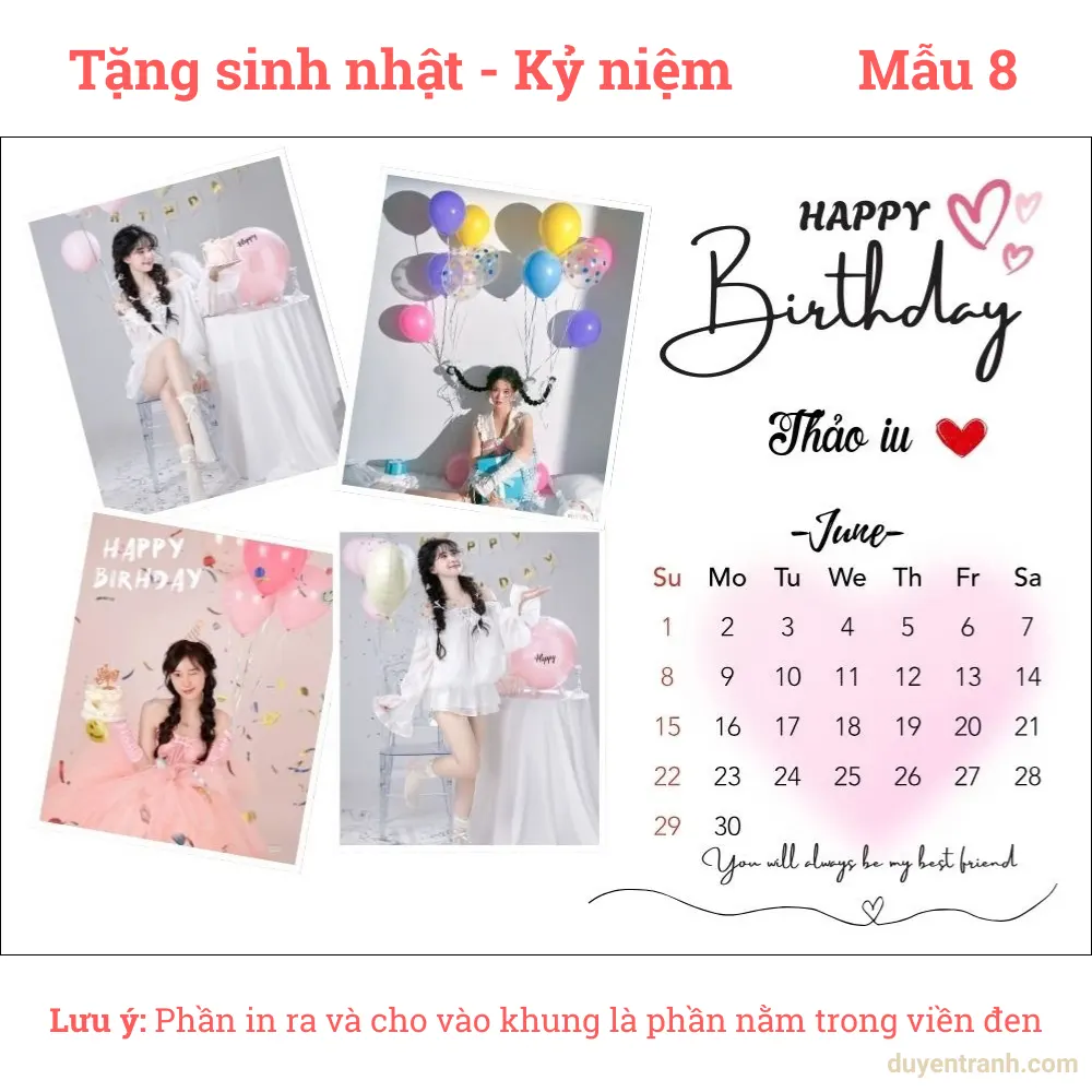 Sinh nhật bạn bè, người yêu, người thân — in ảnh kỷ niệm chung kèm lời chúc. Ngày Quốc tế Phụ nữ 8/3, Phụ nữ Việt Nam 20/10 — tặng mẹ, vợ, bạn gái. Kỷ niệm ngày yêu nhau, ngày cưới — in ảnh cặp đôi đẹp nhất. Valentine, Giáng sinh, Tết — quà tặng cá nhân hóa, không bao giờ trùng. Tốt nghiệp — in ảnh kỷ yếu đóng khung tặng bạn thân.
