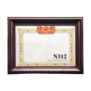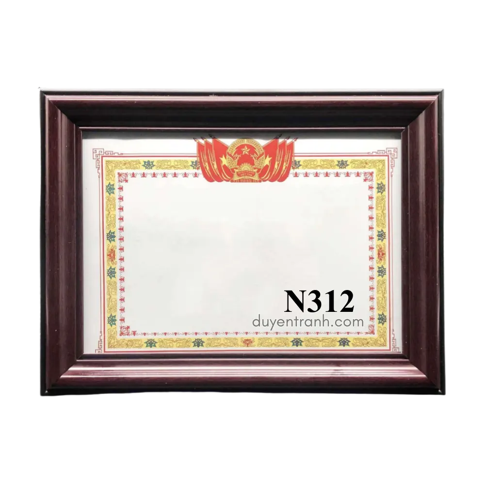 Khung làm từ gỗ composite sơn phủ — nhẹ hơn gỗ thật, chống mối mọt, chống ẩm mốc, không cong vênh theo thời gian. Bề mặt sơn phủ giả vân gỗ hoặc mạ vàng tùy mẫu. Mặt trước là kính trong suốt 2mm bảo vệ bằng khen khỏi bụi bẩn và ẩm mốc. Mặt sau bìa trắng chống mốc (không phải bìa mộc dễ mềm như nhiều nơi khác). Có sẵn chân chống để bàn + móc treo tường + đinh.