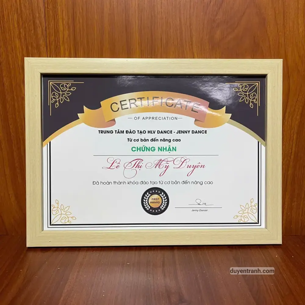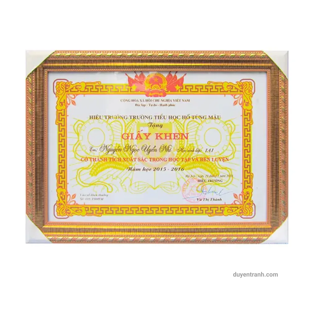 Khung giấy khen A4 (21 x 29.7 cm) tại Duyên Tranh — sản xuất trực tiếp tại xưởng Hà Nội, giá gốc không qua trung gian. Đây là sản phẩm bán chạy hàng đầu, đặc biệt vào mùa tổng kết học kỳ (tháng 5 và tháng 12) và mùa khen thưởng doanh nghiệp cuối năm. Mỗi tháng xưởng xuất hàng nghìn khung giấy khen cho trường học, công ty, cơ quan trên toàn quốc.
