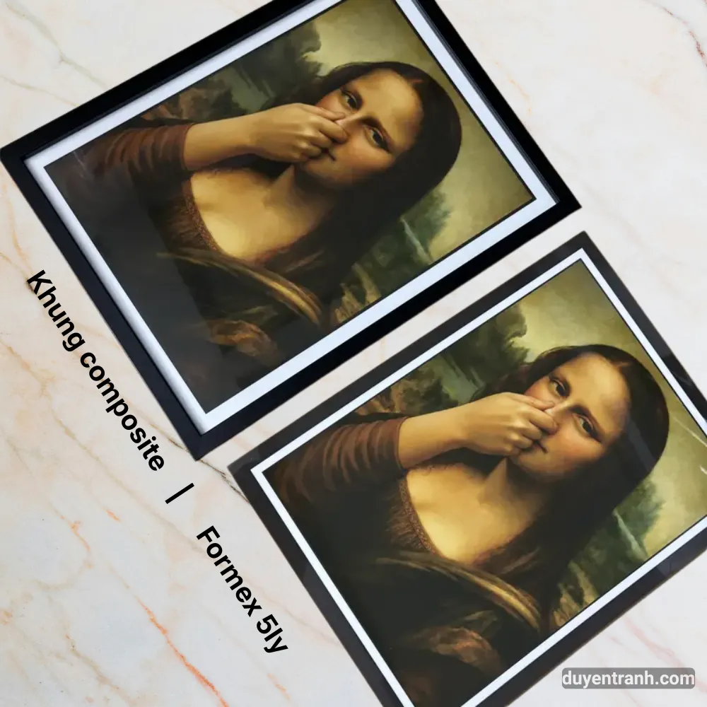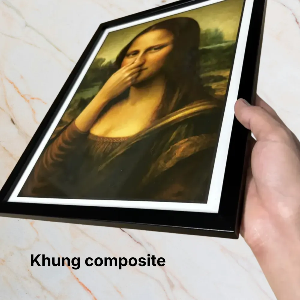 - Khung nhựa composite treo tường: khung viền đen chắc chắn, nền gỗ ép 3mm, bề mặt tráng gương. Kèm móc treo, dùng đinh 3 chân gắn lên tường. Phù hợp khi bạn muốn tranh có khung viền gọn gàng, dễ tháo lắp.